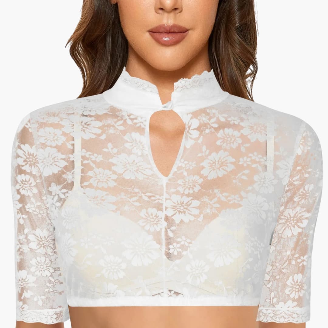 Tato krajková halenka pro ženy je speciálně navržena pro dirndly a tradiční kroje. Díky vysokému límci, jemné krajkové struktuře a dekorativním detailům nabízí klasický vzhled pro slavnostní události jako Oktoberfest. Krátký střih ji činí vhodnou pro tradiční sukně a dirndl šaty.