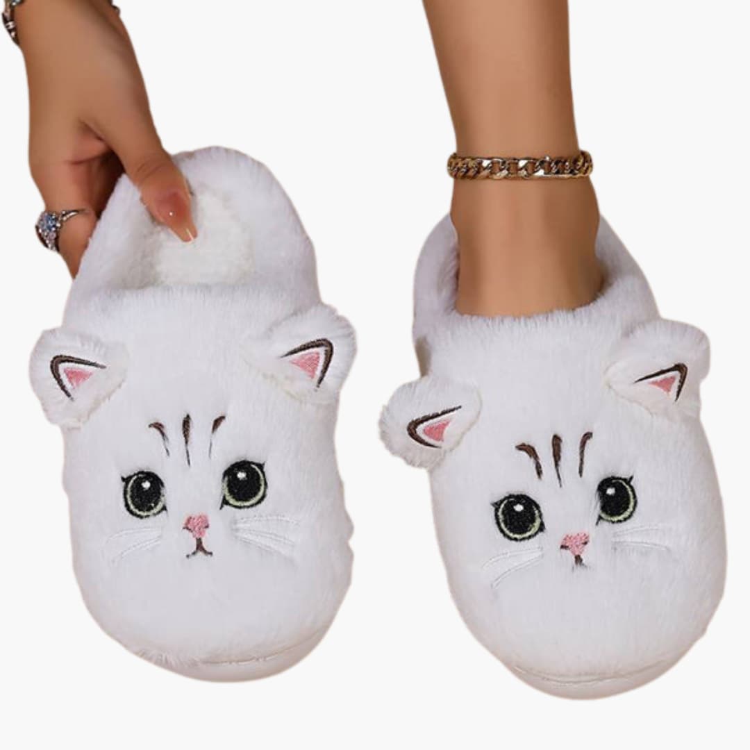 Slip-on pantofle pro ženy s vyšívanou kočičí tváří a plyšovou vnitřní podšívkou