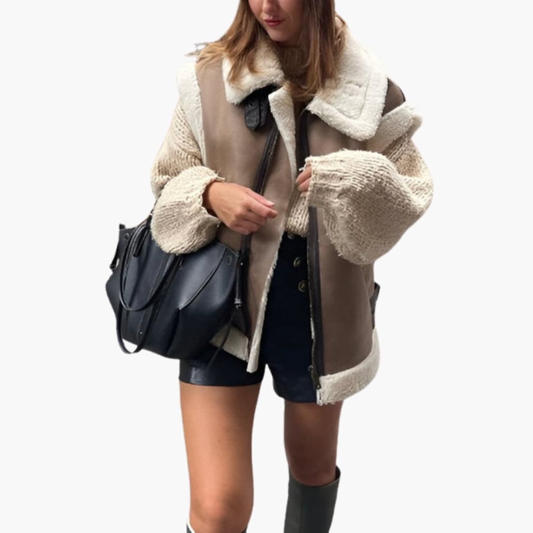 Límec: Široký klopový límec s viditelnou plyšovou podšívkou teddy na okraji.