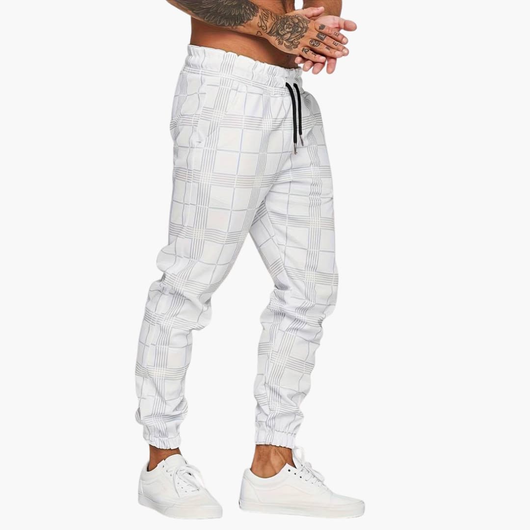 Herrebukser i ternet mønster med elastisk taljebånd, tilspidsede ben og ribstrikkede manchetter.