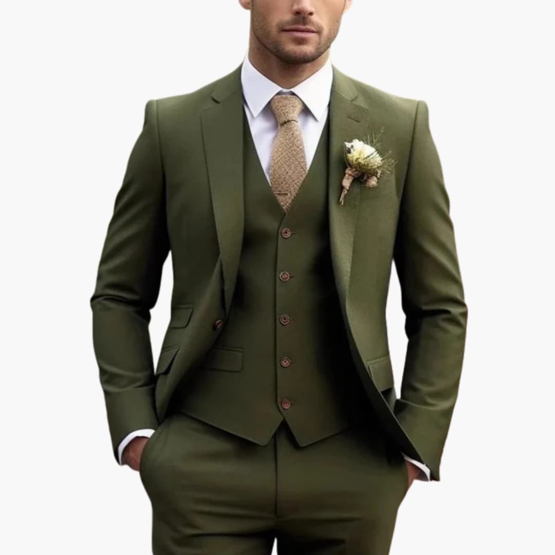 Dieser Herrenanzug besteht aus einem Zweiknopf-Blazer, einer ärmellosen Weste und passenden Hosen. Der Blazer verfügt über ein Revers und Fronttaschen, während die Hose ein gerades Bein und eine Webstruktur hat. Ideal für einen gepflegten, strukturierten Look bei formellen Anlässen.