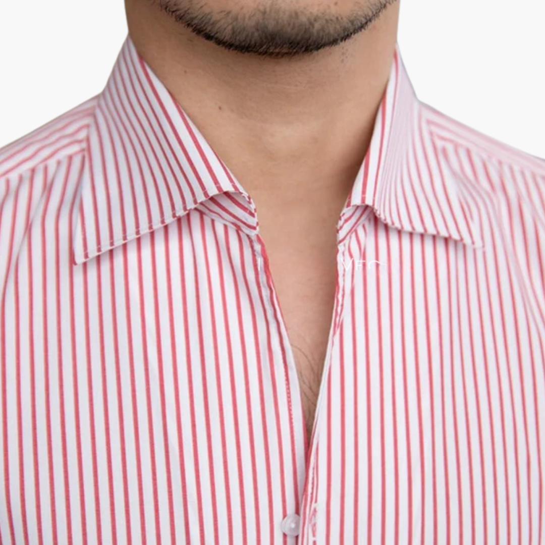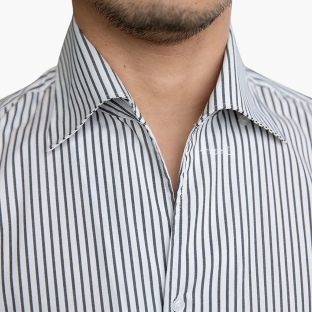 Dieses gestreifte Herrenhemd verfügt über einen kontrastierenden Kragen und eine durchgehende Knopfleiste bis zum Saum. Das Design umfasst lange Ärmel mit verstellbaren Knopfmanschetten. Der Körper zeigt ein vertikal gestreiftes Muster. Das Hemd endet mit einem geraden Saum, der eine einheitliche Linie beibehält.