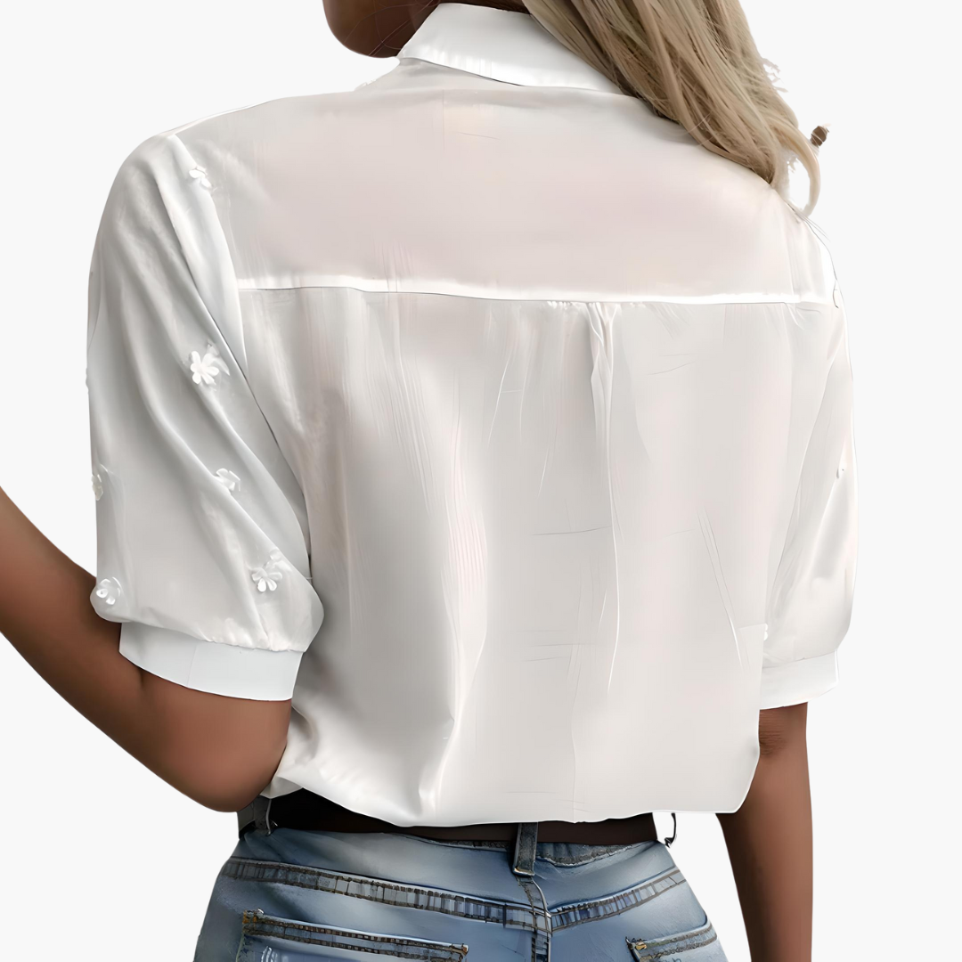 Esta blusa para mujer está hecha de una tela ligera y transpirable, perfecta para el verano. Cuenta con mangas cortas, un cuello mao con abertura en V y un ajuste holgado. El frente presenta detalles perforados y un fino bordado floral. Adecuada para uso diario en climas cálidos.
