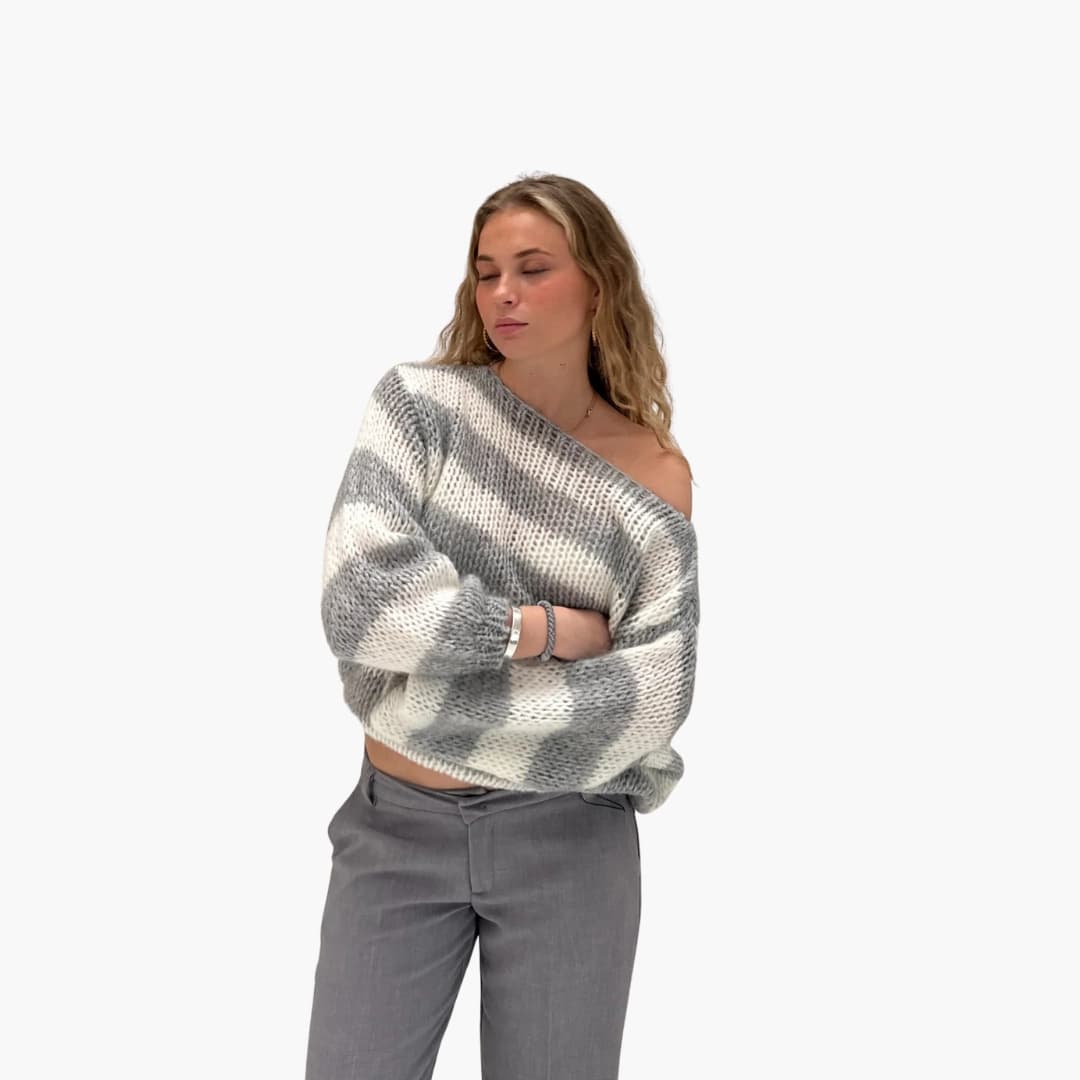 Naisten neulepaita pyöreällä kaula-aukolla, pitkillä hihoilla ja raidallisella tekstuurilla