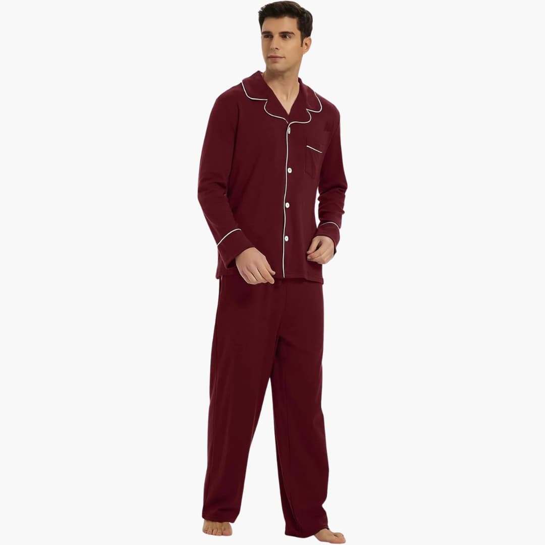 Miesten pyjamapuku napillisen etukappaleen ja pitkien hihojen kanssa