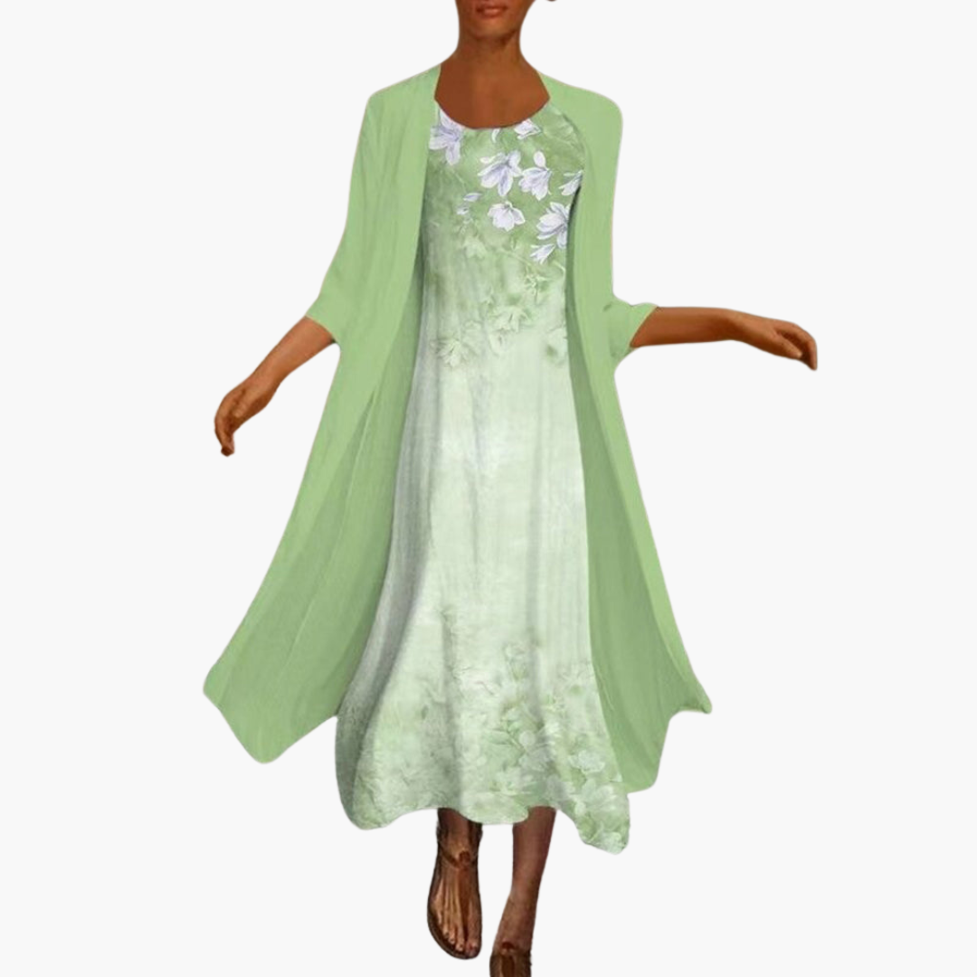 Tämä hurmaava maksimekko kukkakuosilla, yhdistettynä kevyeseen neuletakkiin, tarjoaa täydellisen tasapainon naisellisen eleganssin ja korkean mukavuuden välillä. Valuva siluetti imartelee jokaista vartaloa, ja hengittävä muotoilu on ihanteellinen aurinkoisille päiville. Olipa kyse rentouttavista kävelyistä, puutarhajuhlista tai yksinkertaisesti tyylikkäästä olemuksesta arjessa – tämä asukokonaisuus on aina oikea valinta.