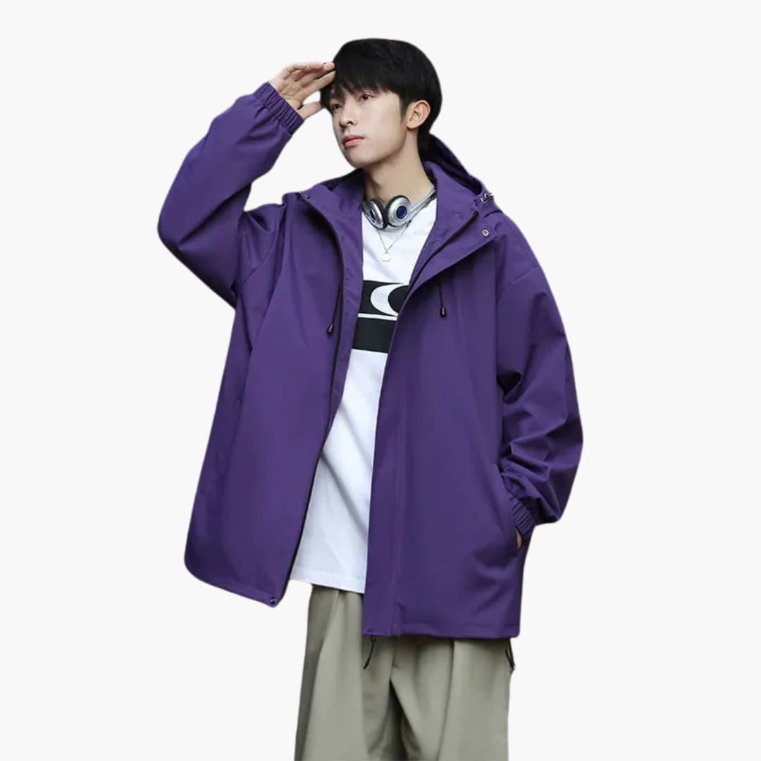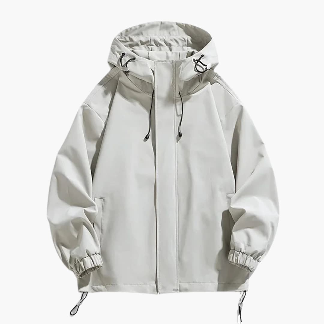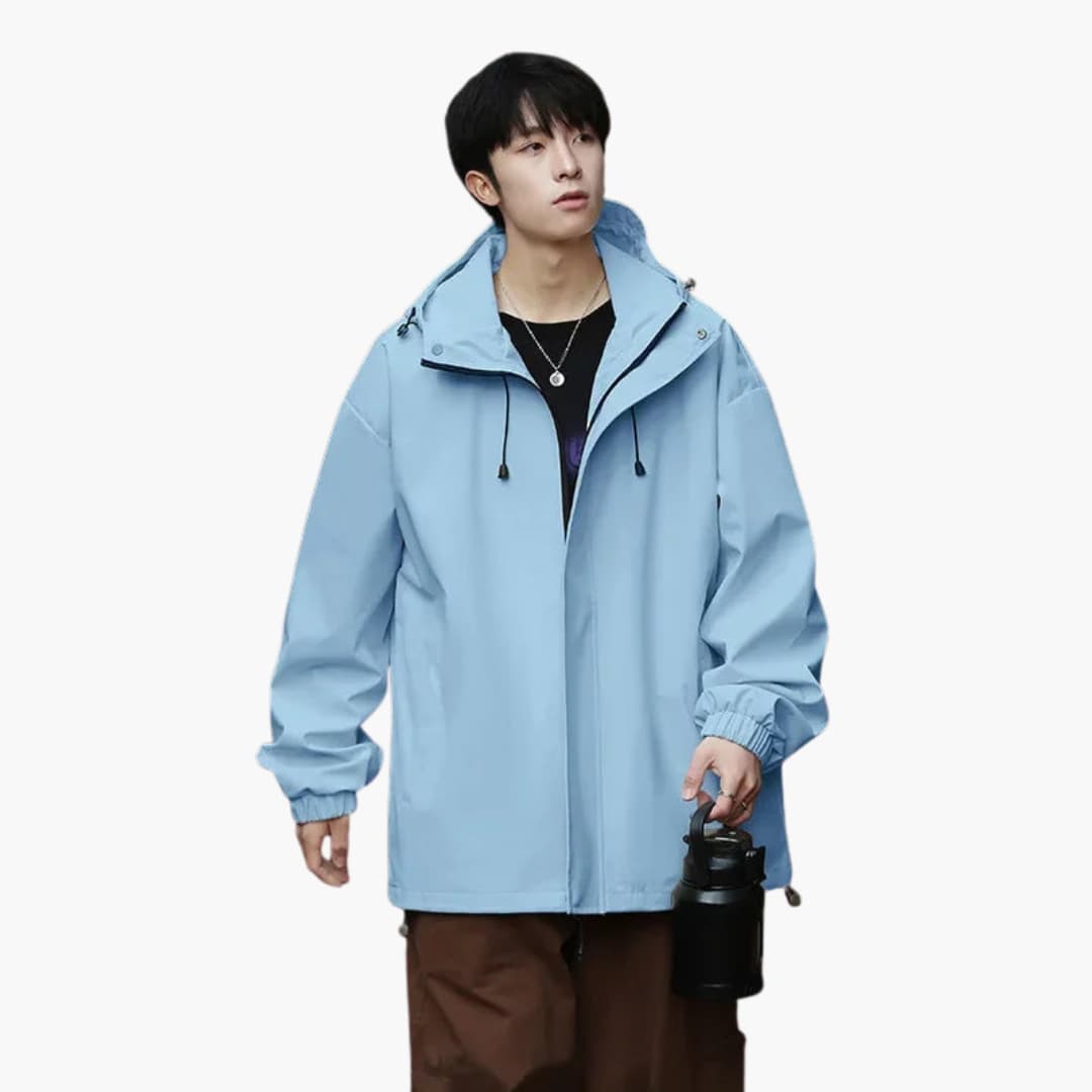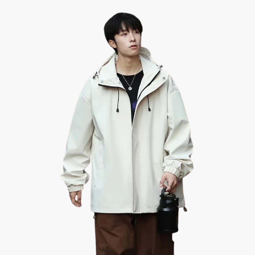 Tässä miesten takissa on korkea kaulus säädettävällä hupulla ja kokopitkä vetoketju edessä. Pitkissä hihoissa on joustavat hihansuut. Suorassa helmassa on säädettävä kiristysnyöri. Yksinkertainen kudottu pinta antaa siistin ilmeen jokapäiväiseen käyttöön.