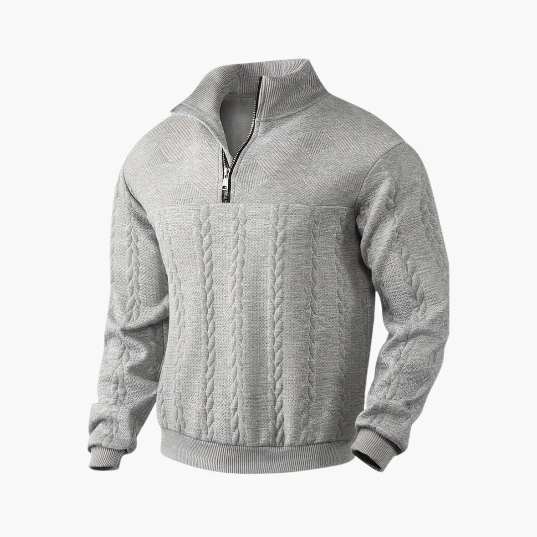 Miesten neulepaita vetoketjukauluksella ja palmikkoneulepinnalla