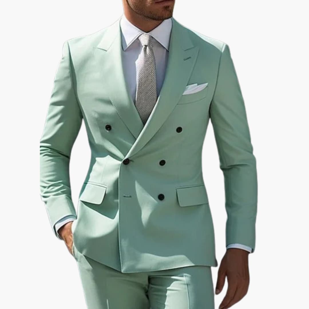 Kaksiosainen miesten puku kaksirivisellä takilla ja huipulla olevalla kauluksella