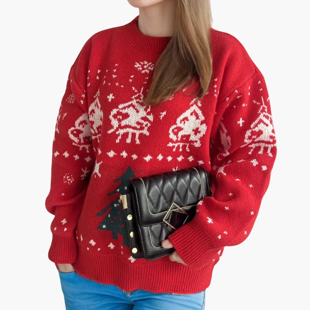 Tässä naisten joulupaidassa on pyöreä pääntie ja neulottu kuvio, jossa on poroja ja joulukuusen motiiveja. Pitkät hihat ja resorireunukset luovat selkeän siluetin. Pinta on teksturoitu neulos, joka esittelee klassisia kauden yksityiskohtia ja antaa paidalle tasapainoisen talvisen ilmeen.