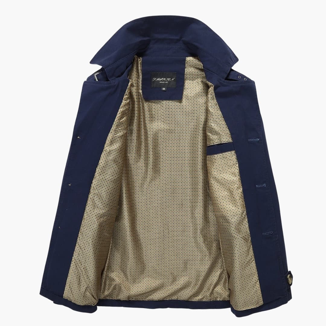 Cóta báistí fir le h-éadach ceann agus dúnta iomlán le cnónna