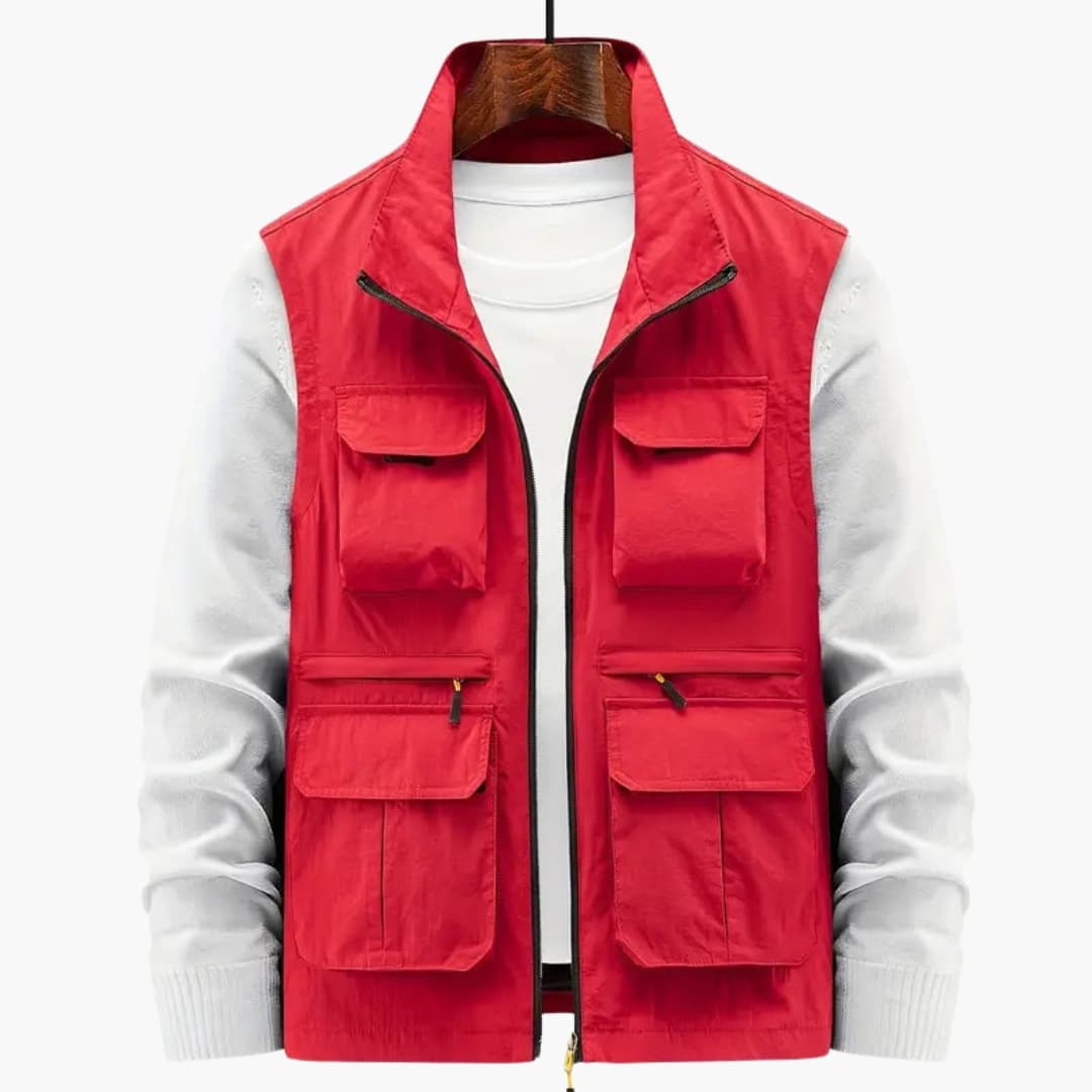 Ova muška prsluk opremljena je ovratnikom koji stoji i patentnim zatvaračem pune dužine sprijeda. Ima četiri prednja džepa s preklopima kao i dva džepa na patentni zatvarač za dodatni prostor za pohranu. Dizajn bez rukava omogućuje nošenje preko različitih odjevnih predmeta. Jednostavna površina ističe praktičan i svestran stil ovog prsluka.