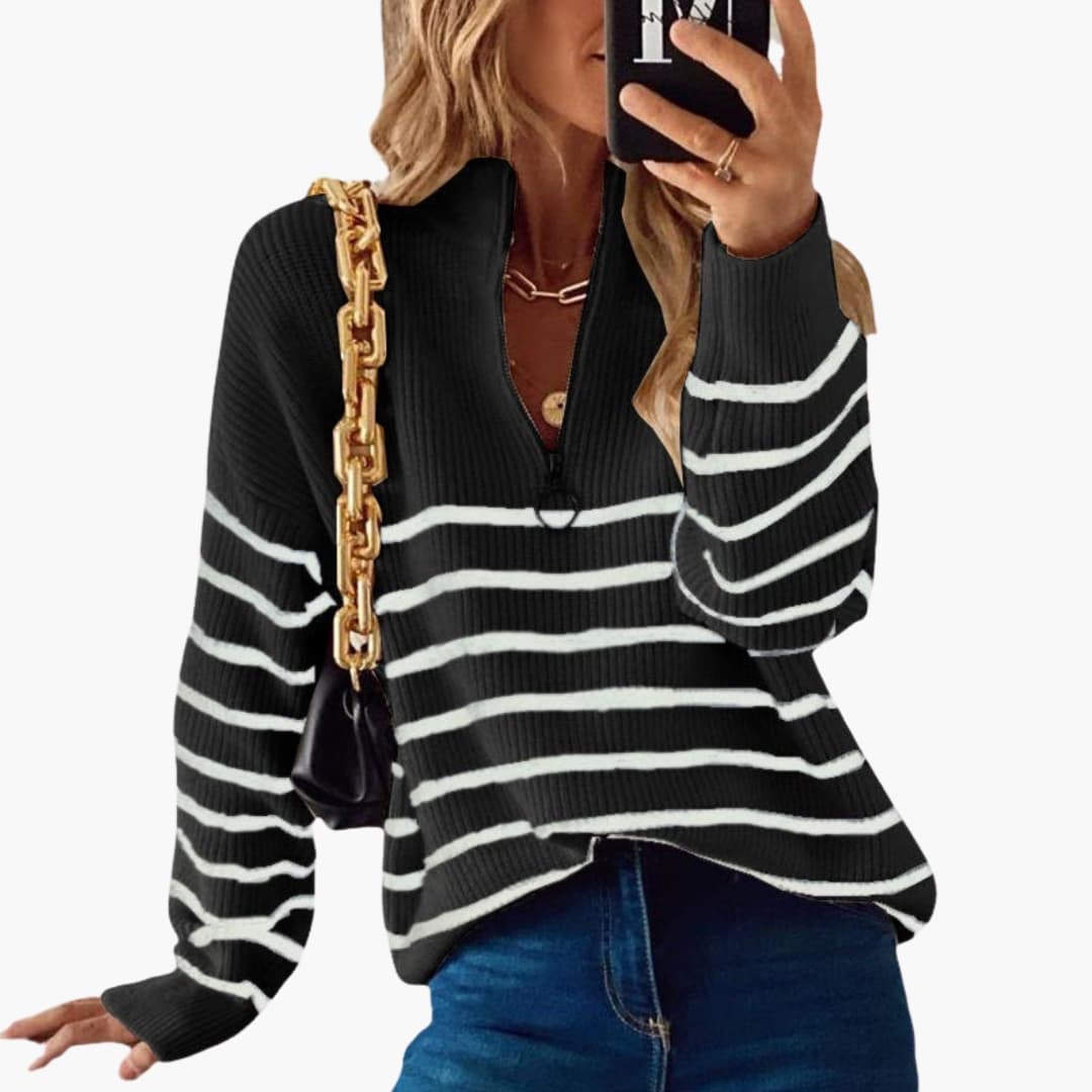 Női kötött pulóver fél cipzárral és csíkos mintával
