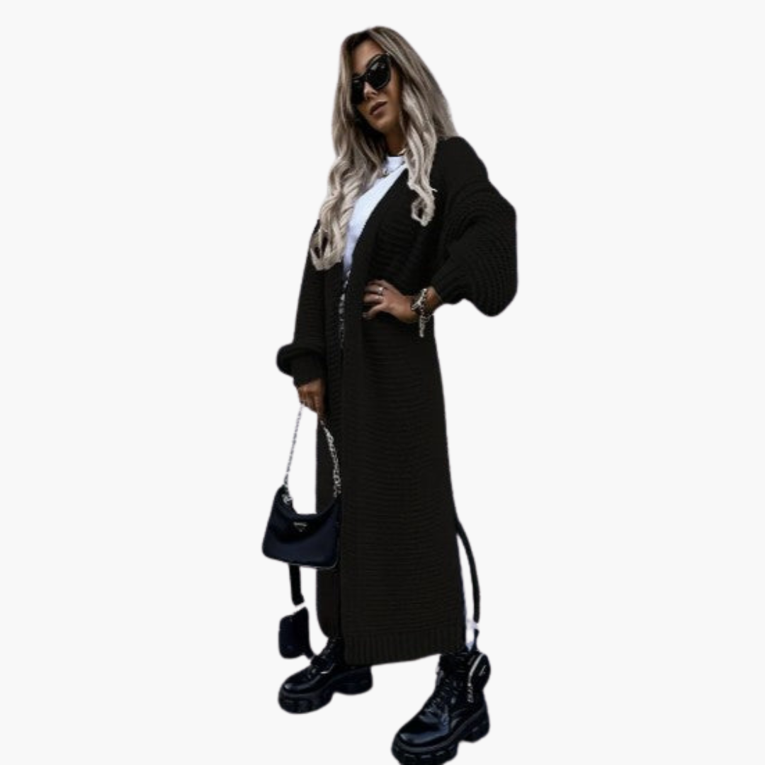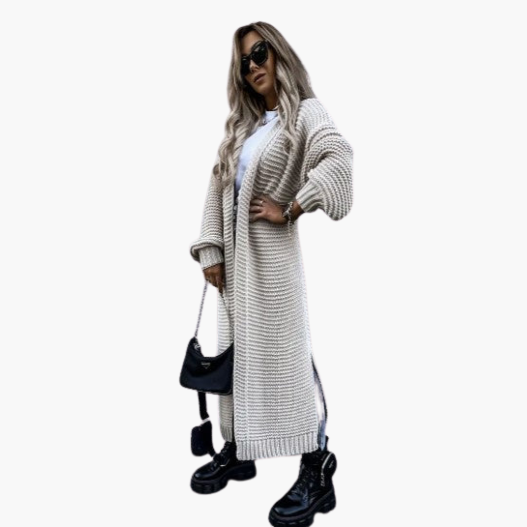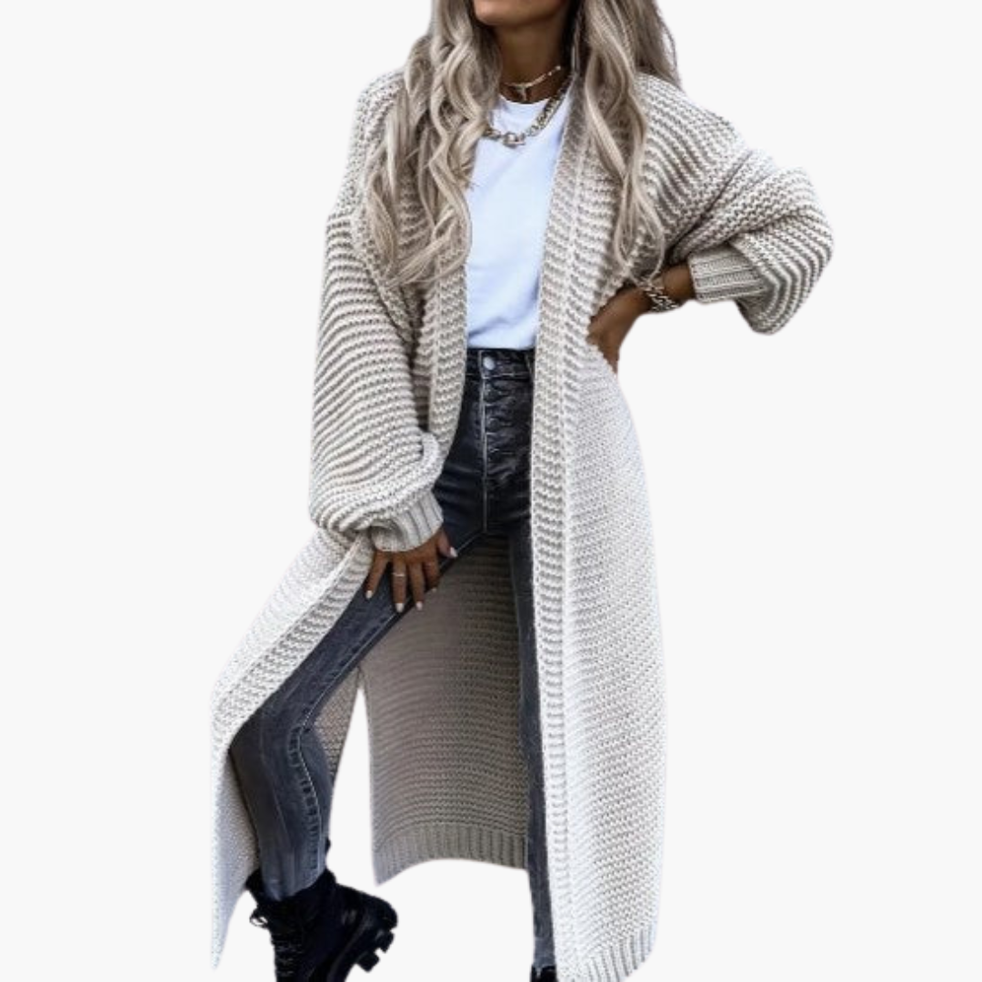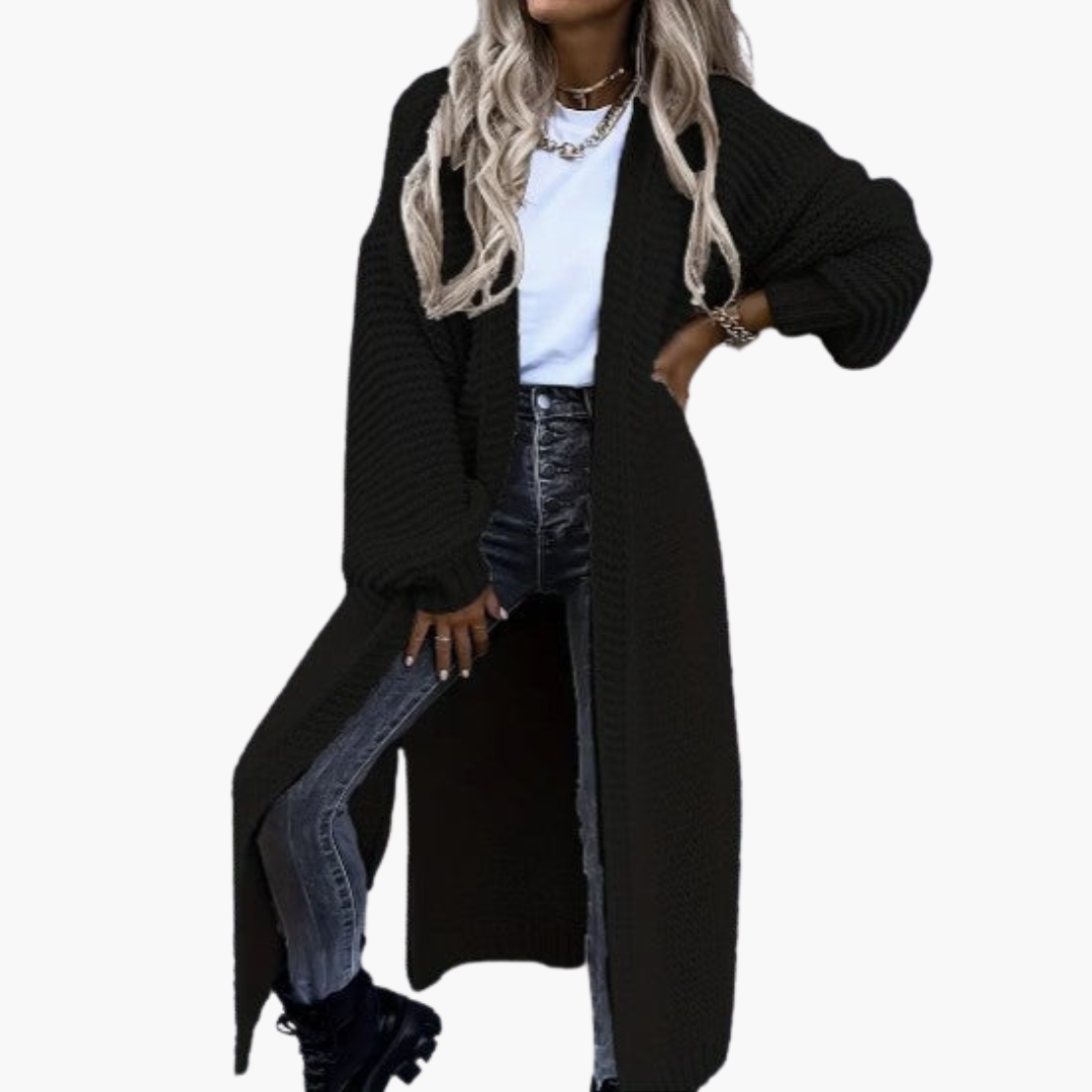 Ez a hosszú női kardigán nyitott szabásával tűnik ki, amely sokoldalú kombinációkat tesz lehetővé különböző felsők fölött. A bordázott ujjmandzsetták finom hangsúlyokat adnak, míg a meghosszabbított szegély extra takarást biztosít. Texturált kötött felületével és bő ujjával a kardigán alkalmas mindennapi viseletre, irodába vagy hűvösebb évszakokban való kiruccanásokhoz.