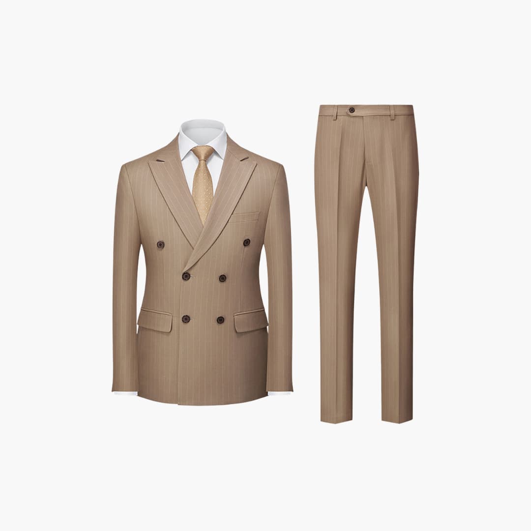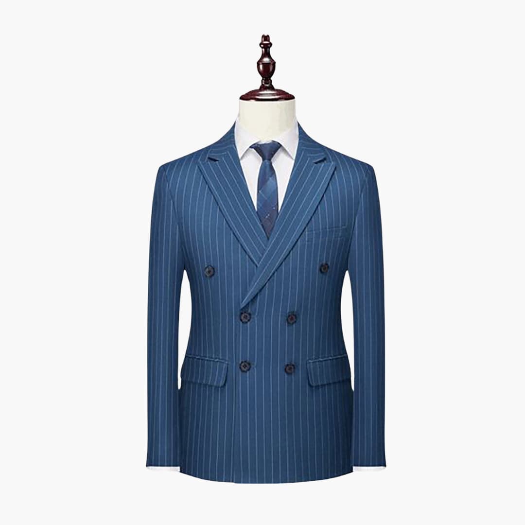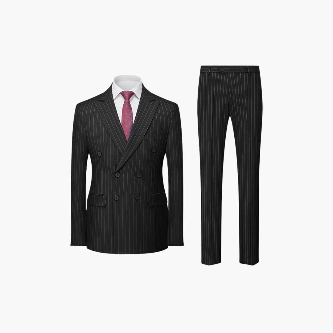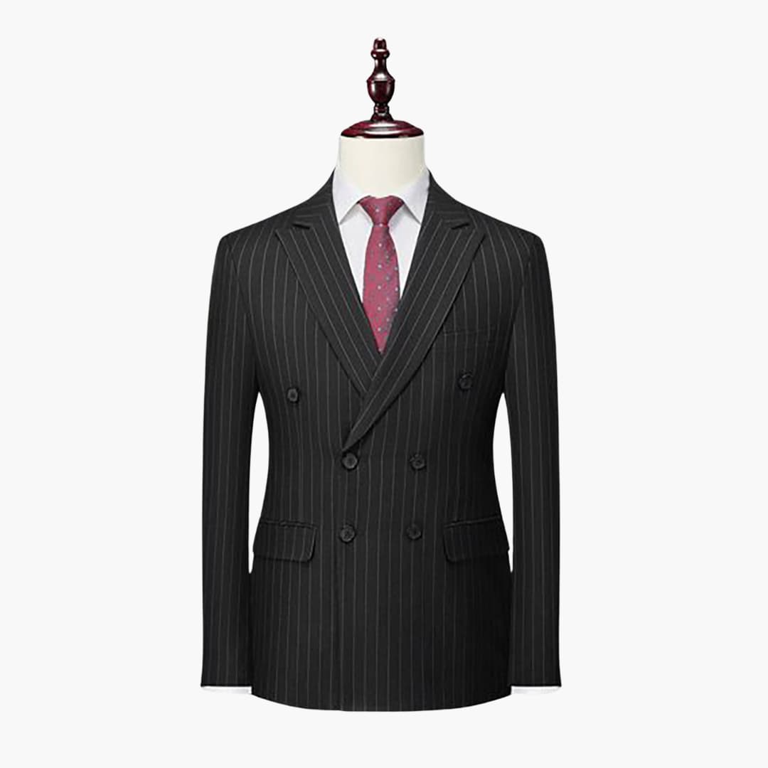 Tweedelig herenkostuum met dubbelgeknoopte jas en pieklapel