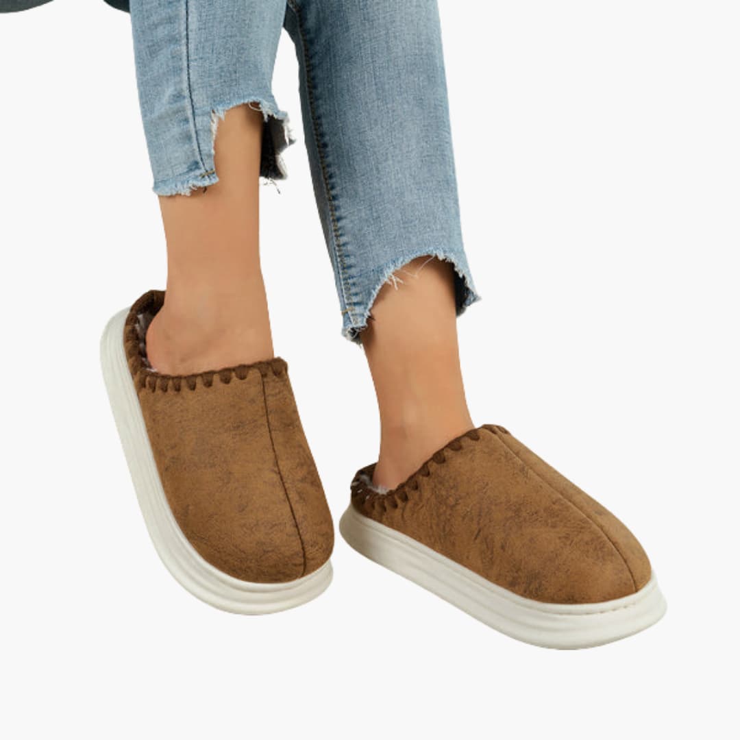 Deze damesslippers hebben een gesloten slip-on bovenzijde met decoratieve stiksels langs de rand. De binnenkant is gevoerd met pluche voor comfort. De zool is ontworpen met een gestructureerde onderkant voor grip. Het buitenoppervlak heeft een pluche uitstraling met zichtbare decoratieve naden.