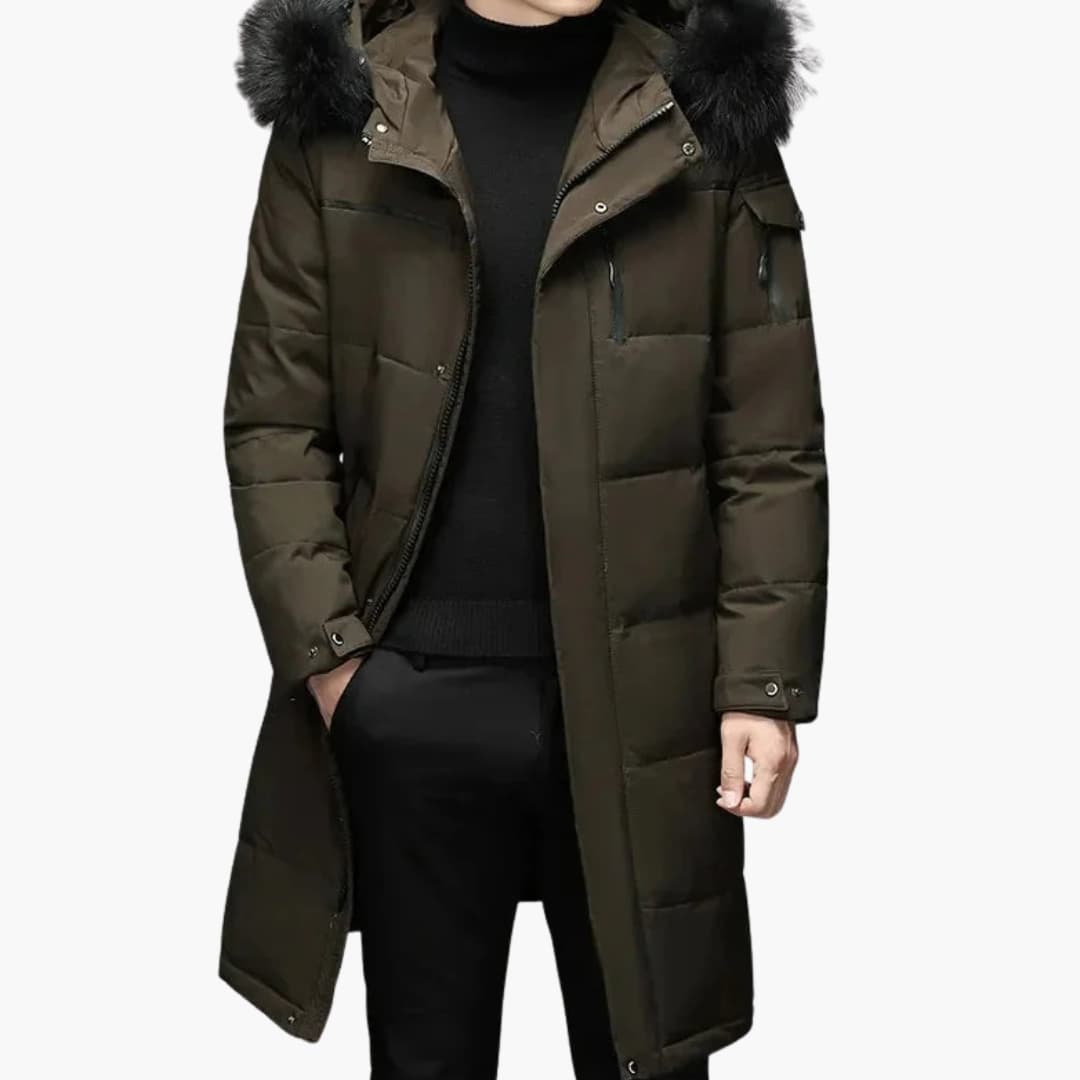 Denne herreparkasen har en lang fasong med en kontinuerlig glidelås foran. Hetten er foret med kunstpels, og innsiden har et polstret syntetisk fôr. Med lange ermer og en forlenget kant gir den full dekning i et enkelt vevd utseende.