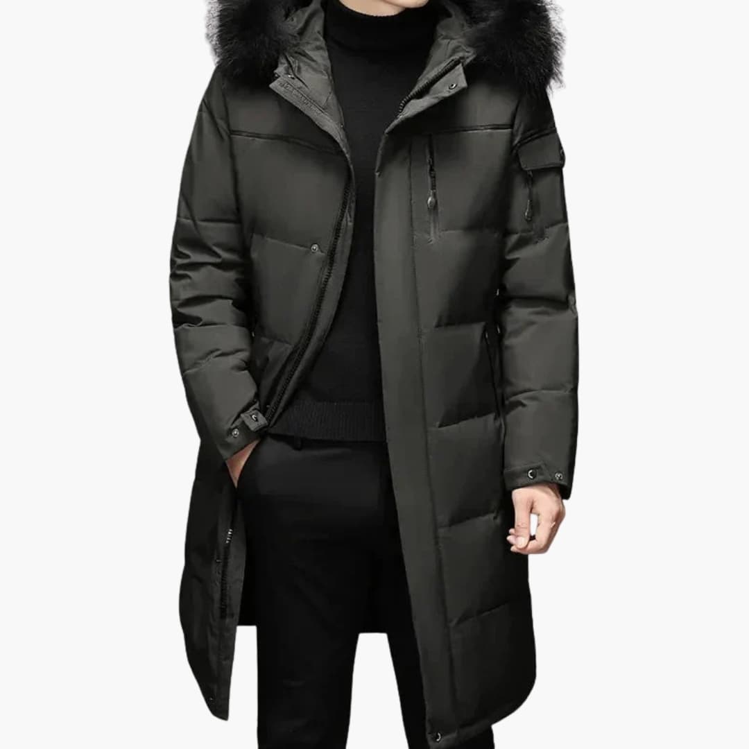 Lang herreparka med hette og glidelås