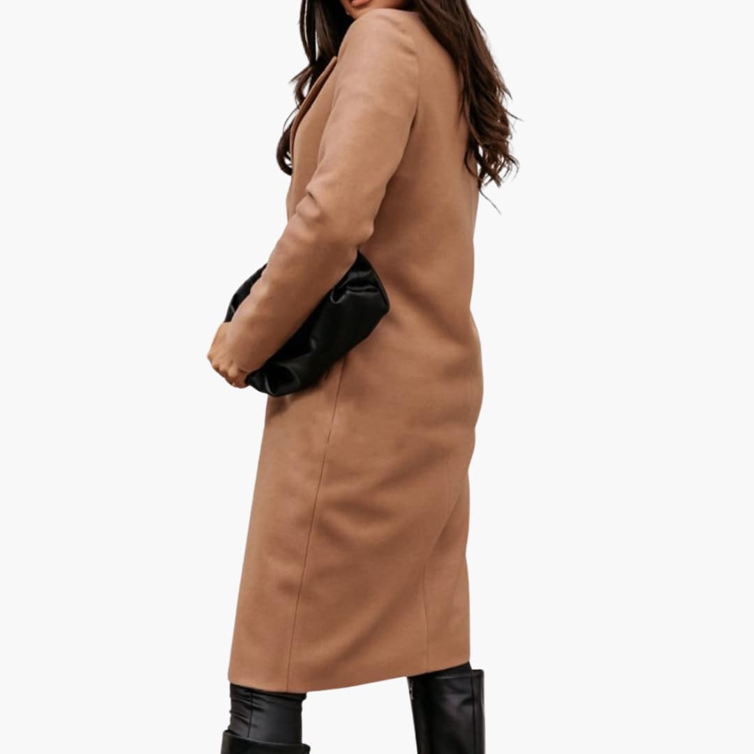 Denne damekåpen har en strukturert hakket krage og knappelukking. Lange ermer gir full dekning, mens to sidelommer er integrert i hoftehøyde. Den rette hemmen fremhever kåpens lengde og gir snittet et klart, strukturert utseende. Designet passer godt med ulike antrekk og egner seg for forskjellige lag-på-lag-stiler.