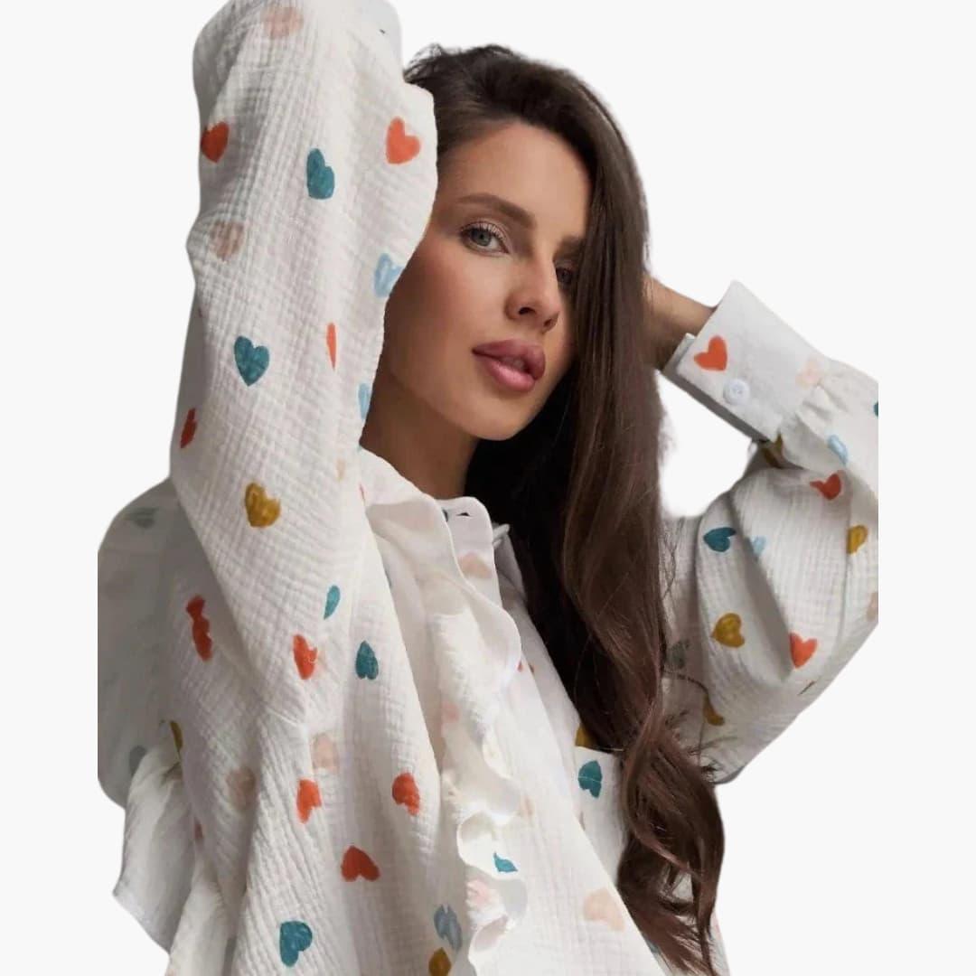 Damska sukienka koszulowa z falbanami – kwiatowy wzór z długimi rękawami