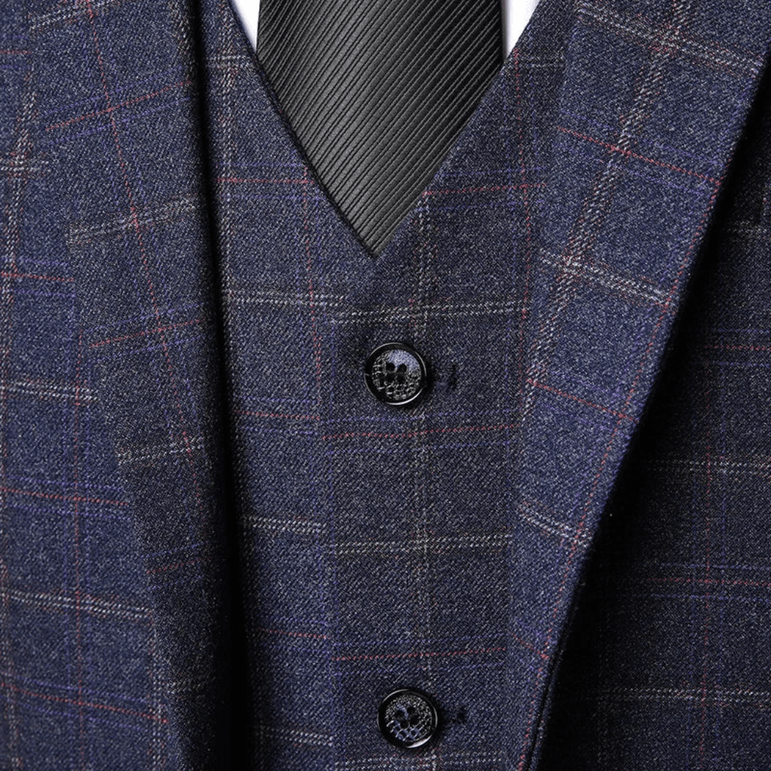3-częściowy garnitur męski z kamizelką i marynarką – wzór w kratę