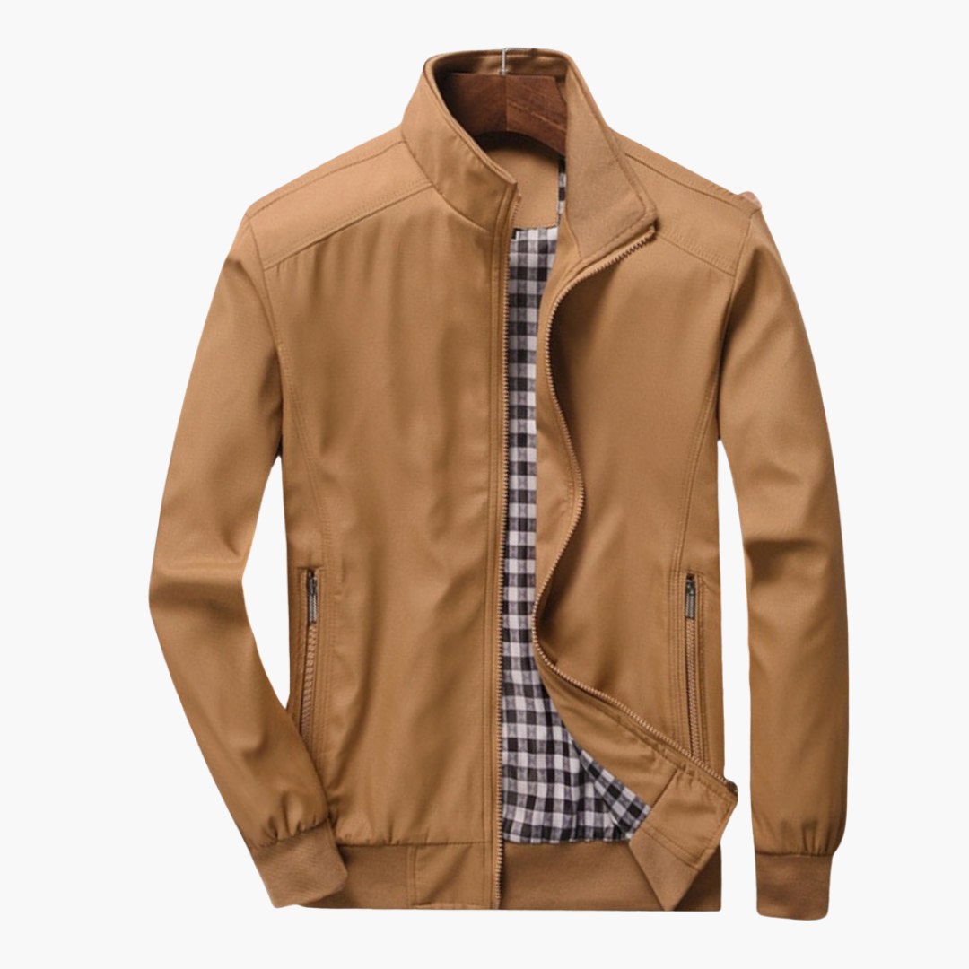 Ta męska kurtka bomberka ma stójkę i zamek błyskawiczny na całej długości z przodu. Dwie pionowe boczne kieszenie są wyposażone w zamki błyskawiczne. Kurtka ma długie rękawy z prążkowanymi mankietami. Proste obszycie ma prostą tkaną powierzchnię i kratkowaną podszewkę.