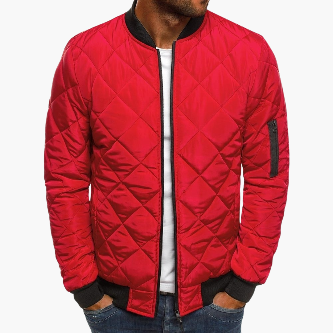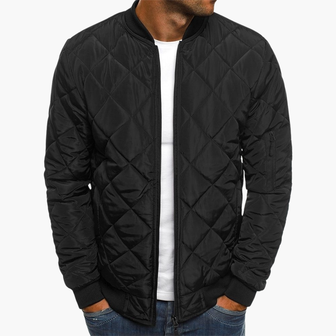 Ta męska kurtka bomberka ma krótki kołnierz i zamek błyskawiczny z przodu. Posiada długie rękawy z prążkowanymi mankietami oraz prążkowany dół dla czystej sylwetki. Projekt obejmuje dwie boczne kieszenie oraz kieszeń na zamek na rękawie. Powierzchnia prezentuje pikowany wzór diamentowy na całym korpusie i rękawach.