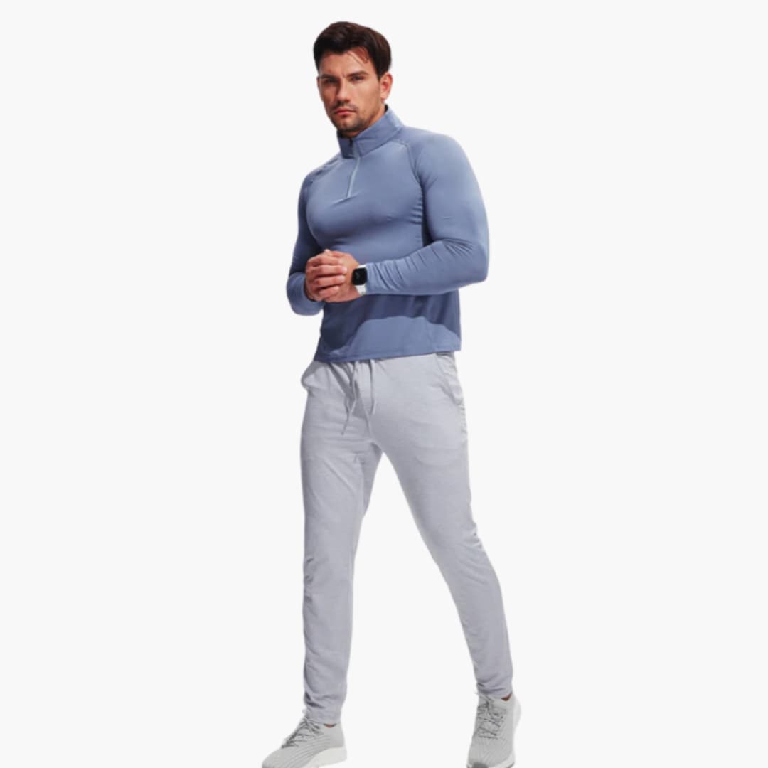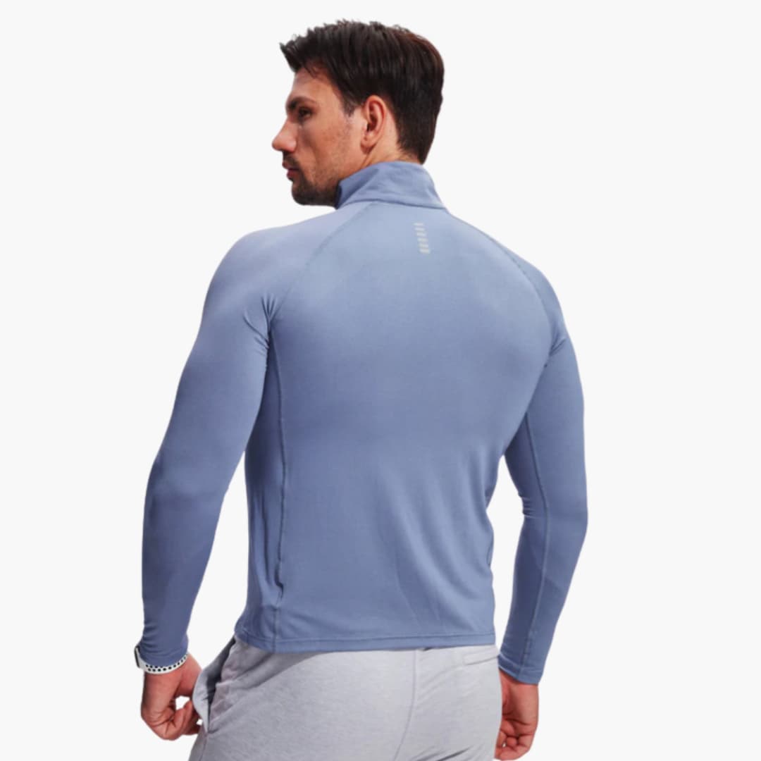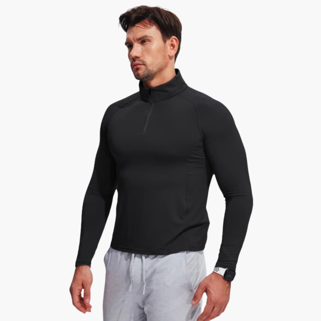 Ta męska koszula posiada dekolt z półzamkiem z krótkim zamkiem z przodu. Ma długie, dopasowane rękawy o wąskim kroju wzdłuż ramion. Dół jest prosty, tworząc wyraźną dolną krawędź. Gładka dzianina rozciąga się na całej powierzchni ubrania, zapewniając jednolity wygląd.
