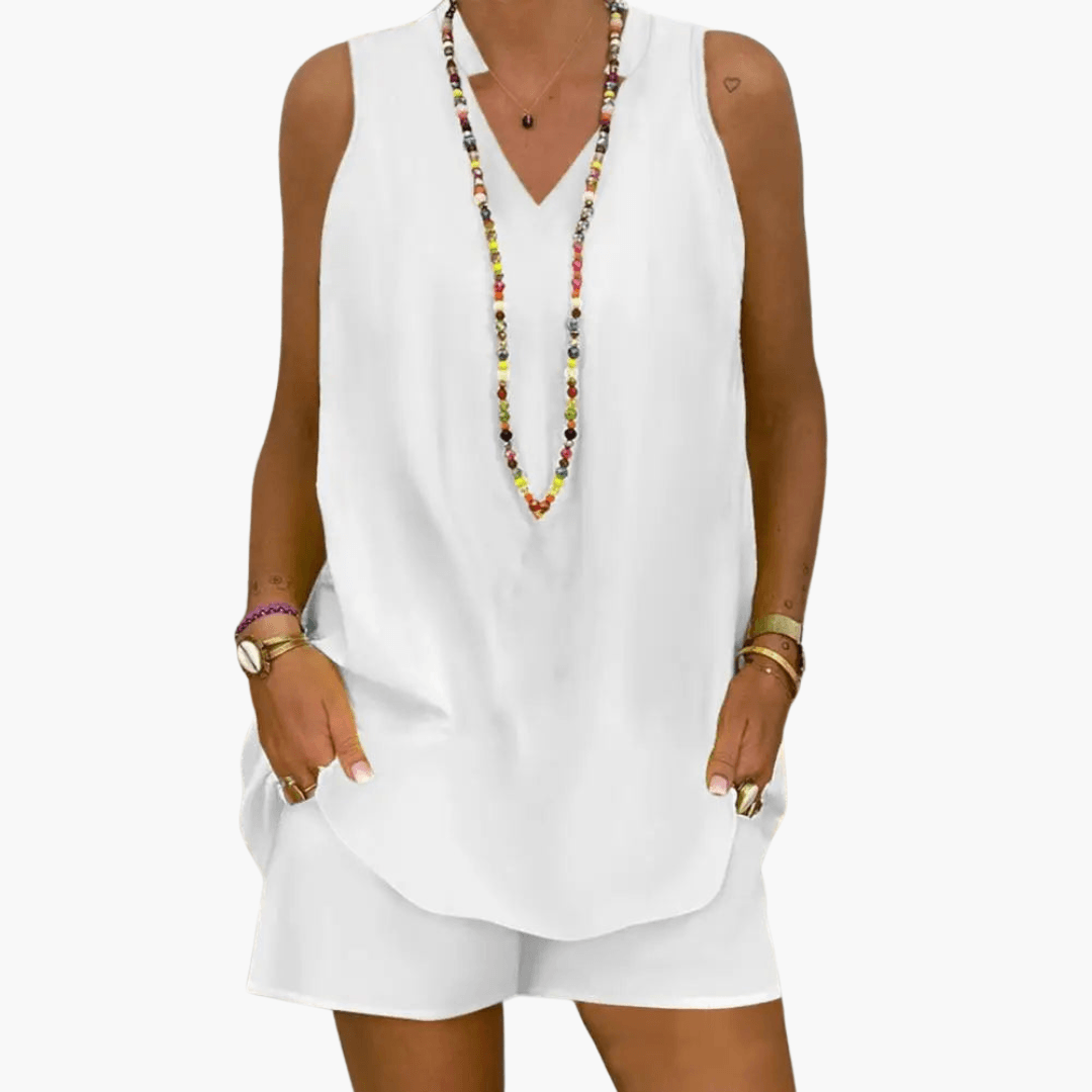 Ciesz się słonecznymi dniami w zestawie łączącym lekkość i stylową elegancję. Niezależnie czy na brunchu, plaży czy podczas miejskiego spaceru – ten strój oferuje korzystną sylwetkę i uczucie lekkości. Idealny na lato, łączy modną świeżość z maksymalnym komfortem.
