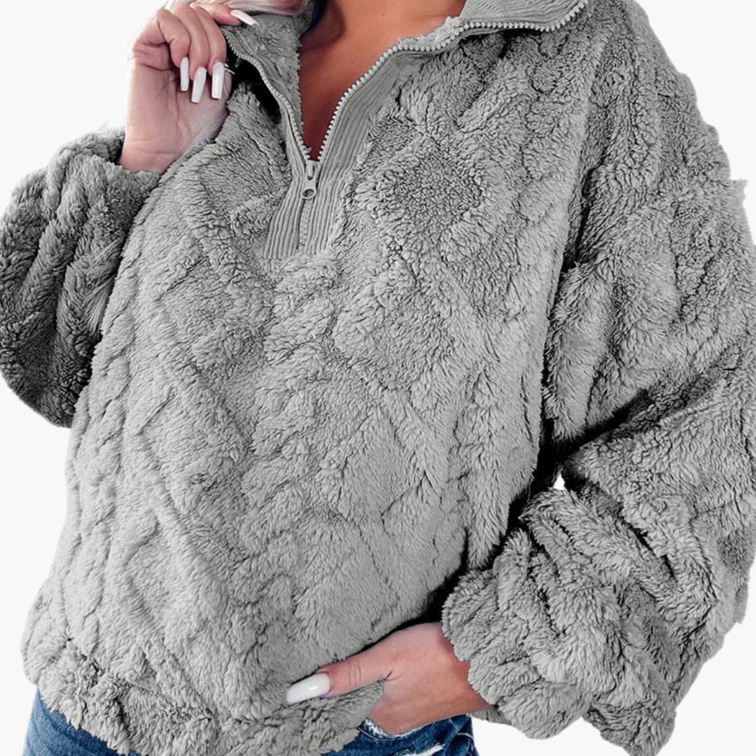 Ten damski sweter posiada kołnierz typu stójka z przednim zamkiem błyskawicznym. Ma długie rękawy i prosty dół. Powierzchnia prezentuje fakturowany, waflowy wzór. Oversize'owy krój pozwala na noszenie go na inne ubrania, zachowując jednolitą sylwetkę.