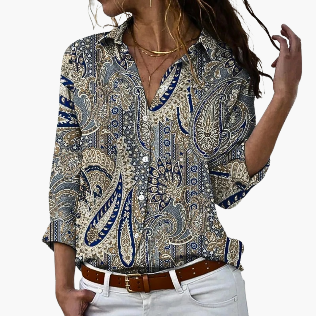 This women's blouse features a V-neck with a partially continuous button placket and long sleeves. The printed surface showcases either a floral or paisley pattern, adding visual depth to the design. The straight hem and loose fit provide a defined shape suitable for various occasions.