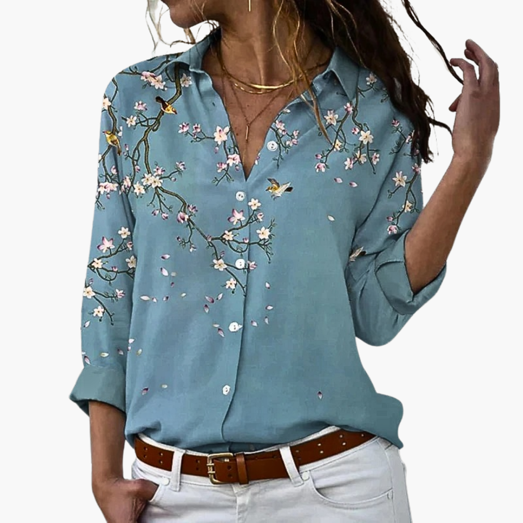 Printed blouse with button placket and V-neck.