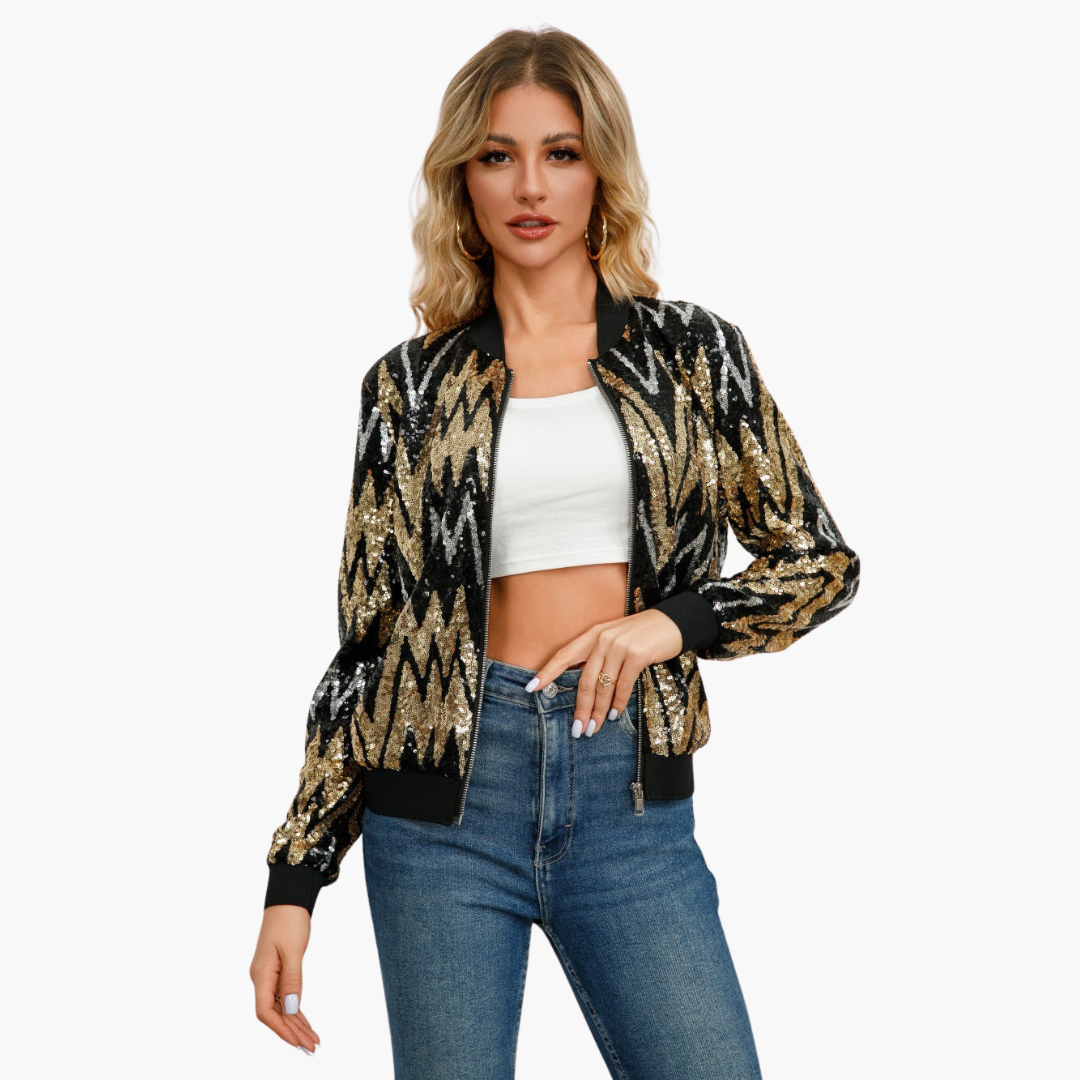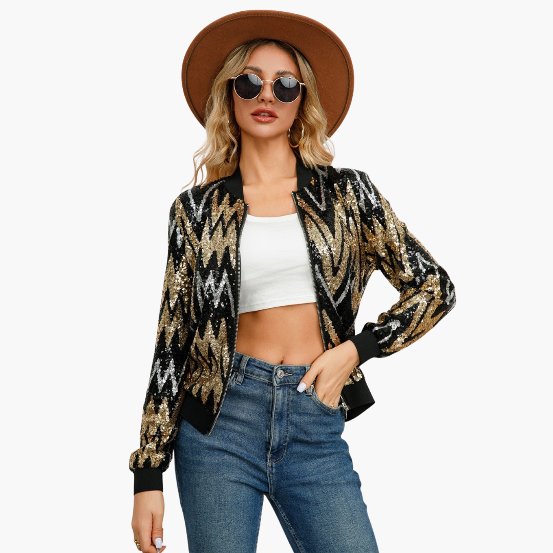 Women's Bomber Jacket with Zipper and Sequin Surface