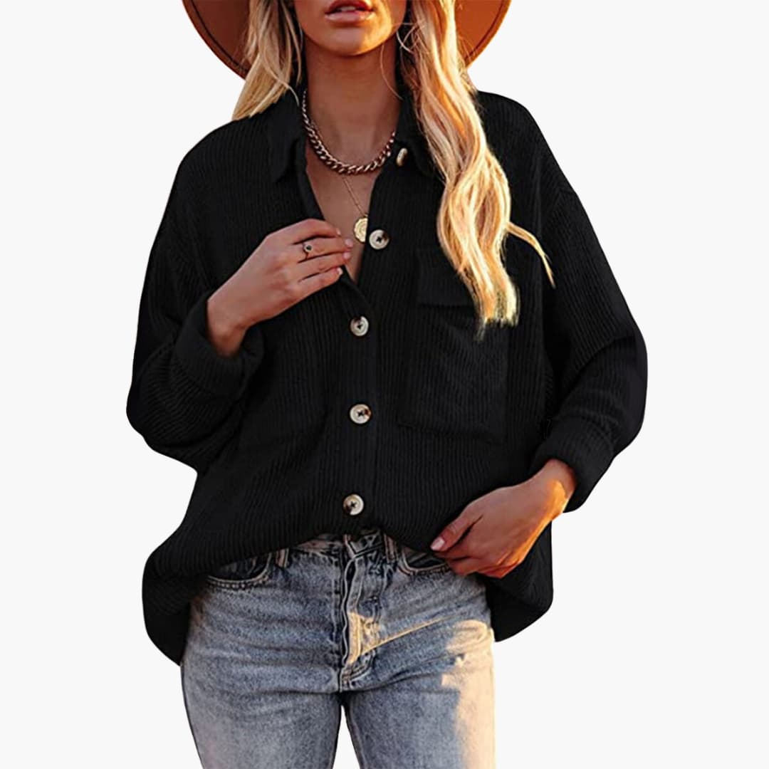This women's cord jacket features a button closure at the front and a classic lapel collar. The loose fit is ideal for layering, and the long sleeves end with buttoned cuffs. Two front pockets provide storage space, while the cord material offers warmth on cooler days.