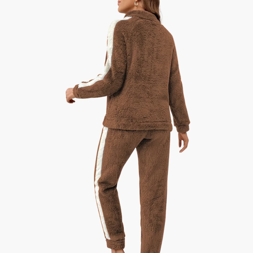 Este conjunto de roupa confortável para mulher consiste num pulôver com fecho de correr até meio e mangas compridas, juntamente com calças de treino combinando com cintura elástica. É feito de um material confortável e é ideal para usar nos meses mais frios.