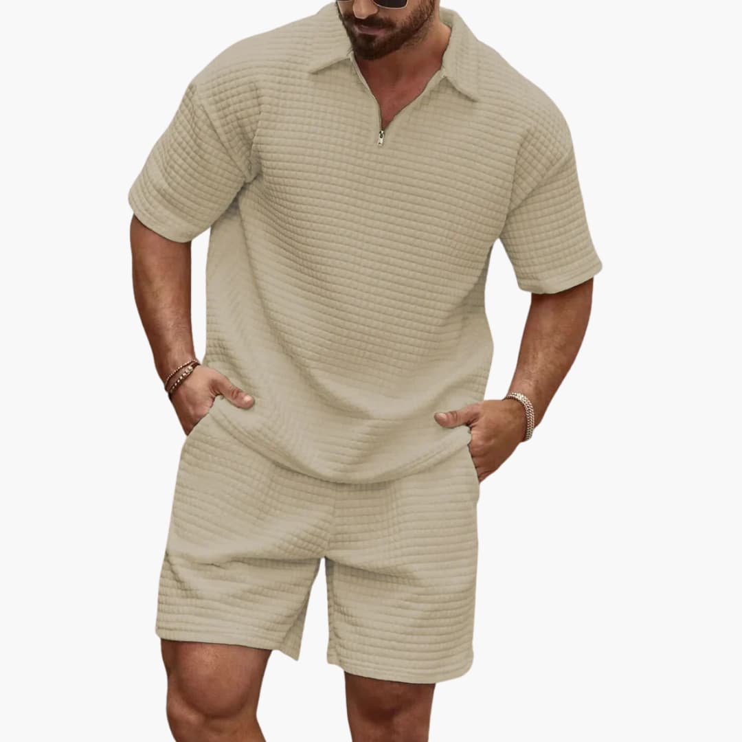 Herrars sommarsats med pikétröja och shorts i ribbad tyg