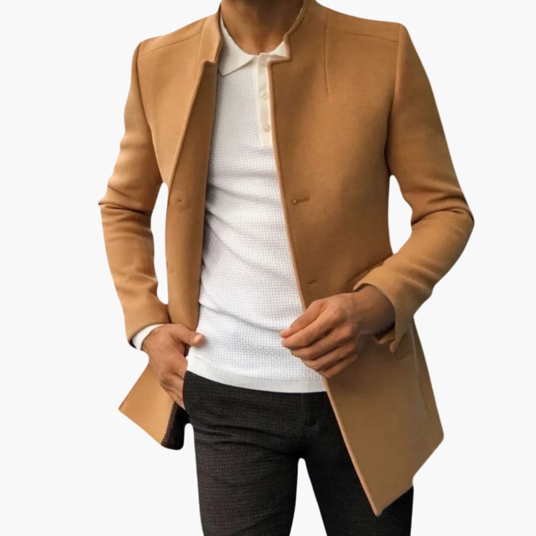 Denna herrkappa har en strukturerad kavajslag som övergår i en knappslå framtill. Bröstområdet är fritt från ytterligare detaljer, medan två vertikala slitsfickor är integrerade på sidorna. Långa ärmar avslutas prydligt och en rak fåll fulländar den släta vävda ytan.