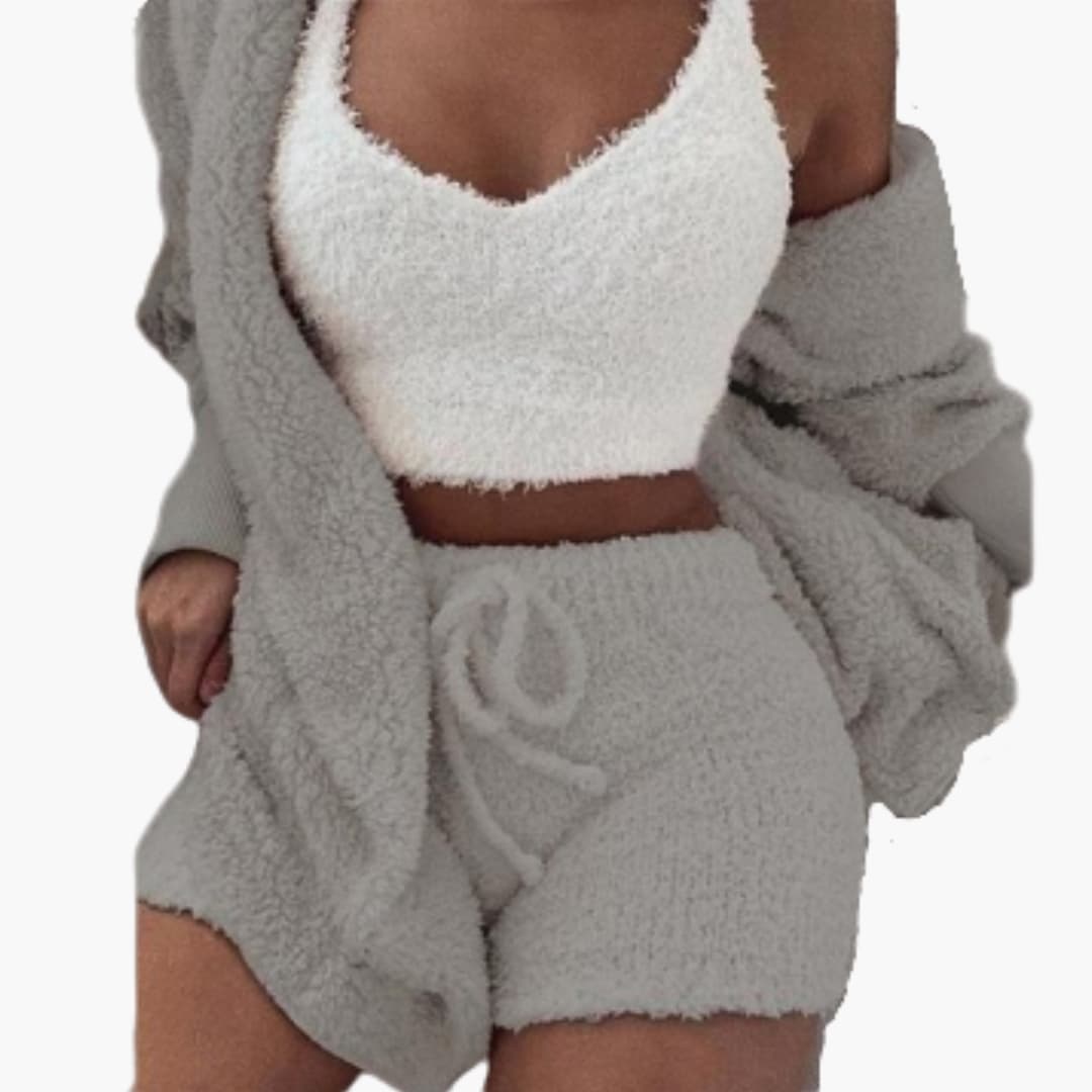Tredelat kvinnligt lounge-set med stickad cardigan och shorts