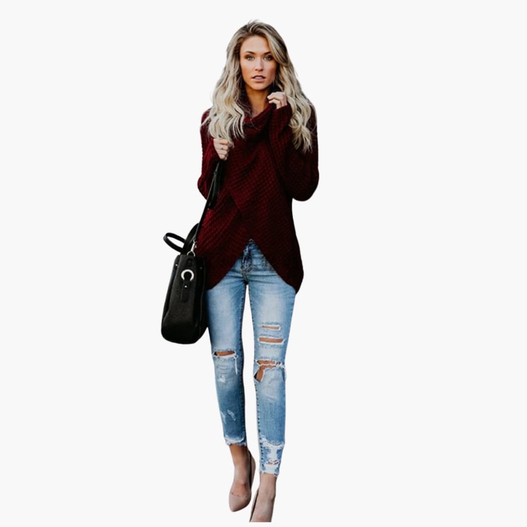 Kvinnors stickade pullover med sjalkrage och omlottlook
