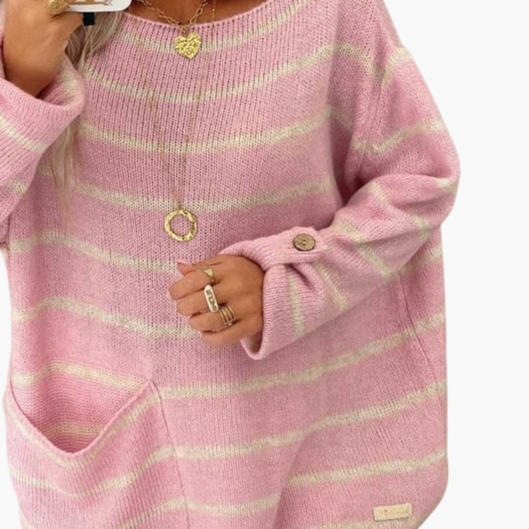 Randig kvinnlig stickad tröja med båtringning och framficka.